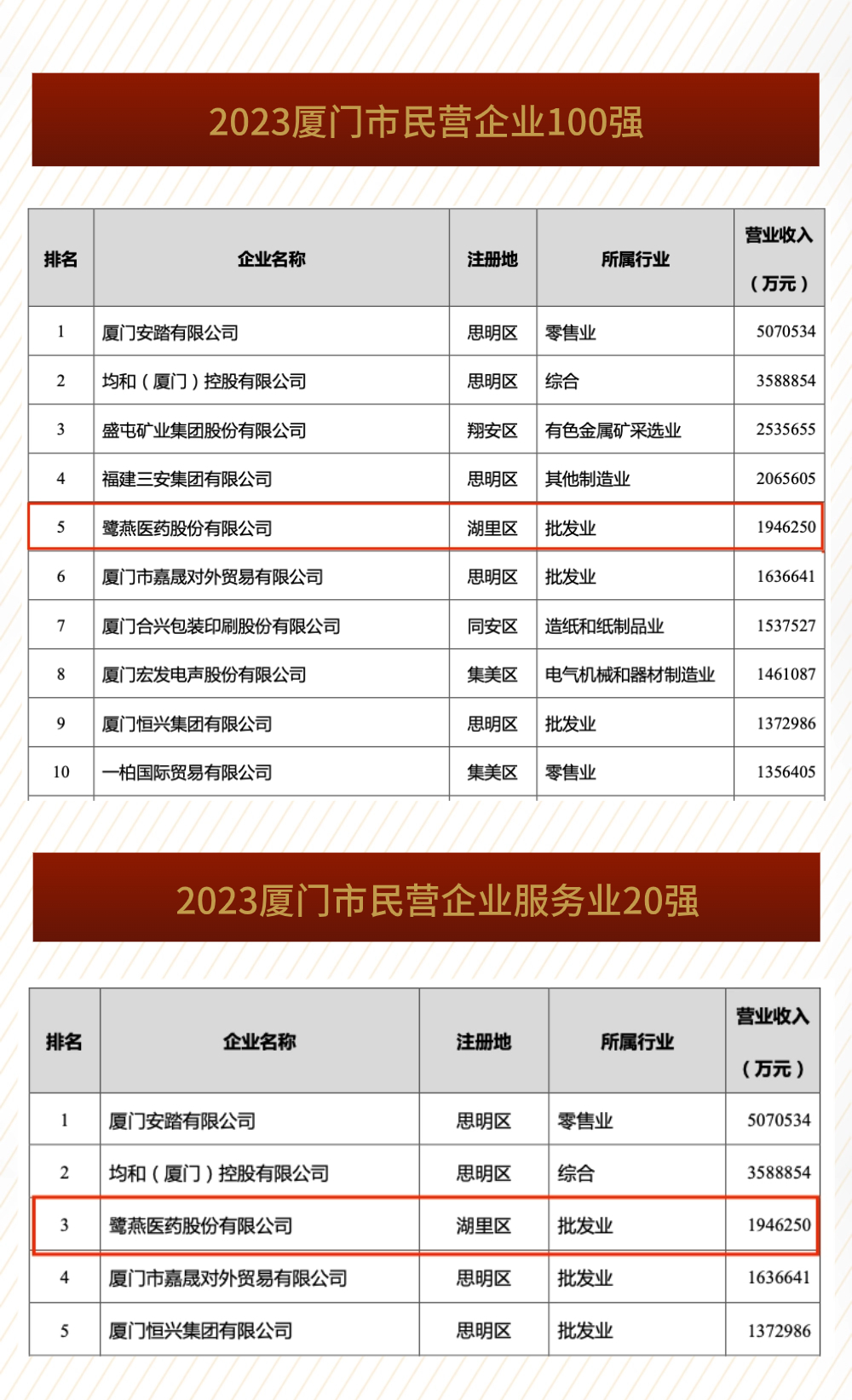喜報(bào) | 鷺燕醫(yī)藥榮列2023廈門市民營企業(yè)100強(qiáng)等系列榜單!