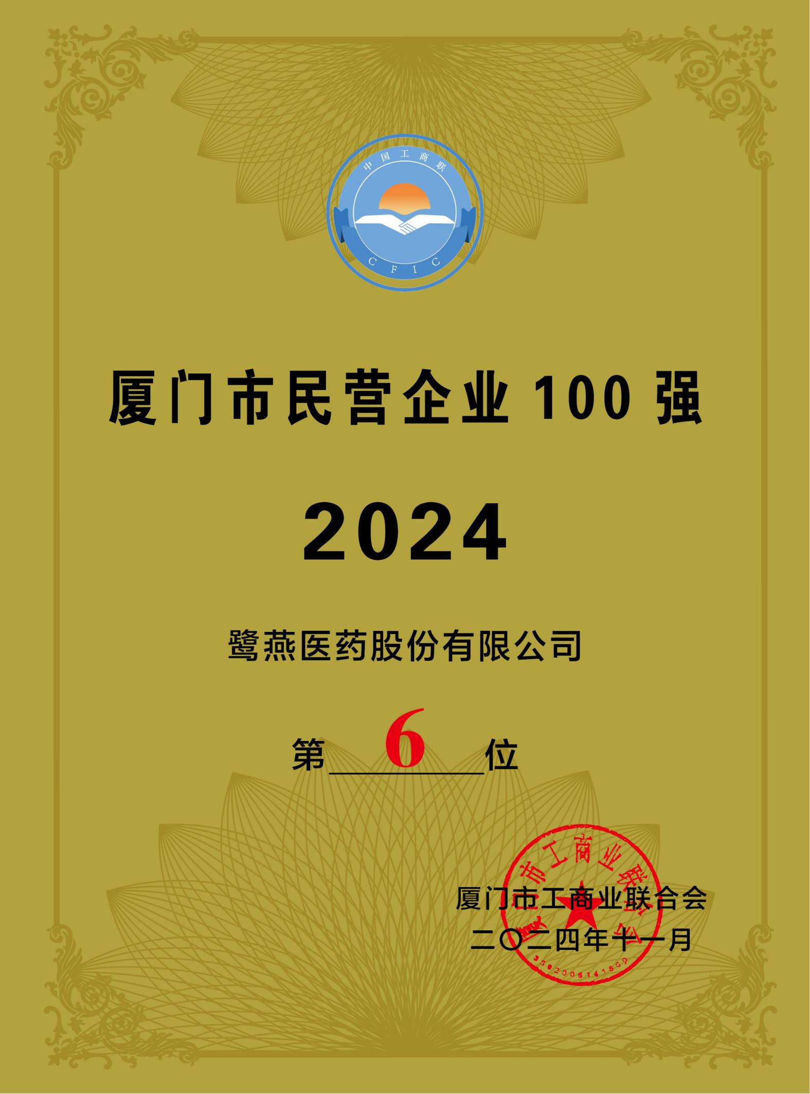 2024年廈門企業(yè)家日大會(huì)于11月1日召開,會(huì)上發(fā)布2024廈門市民營企業(yè)100強(qiáng)榜單、2024廈門市民營企業(yè)服務(wù)業(yè)20強(qiáng)榜單。鷺燕醫(yī)藥榮登2024廈門市民營企業(yè)100強(qiáng)榜單第6位,2024廈門市民營企業(yè)服務(wù)業(yè)20強(qiáng)榜單第4位!