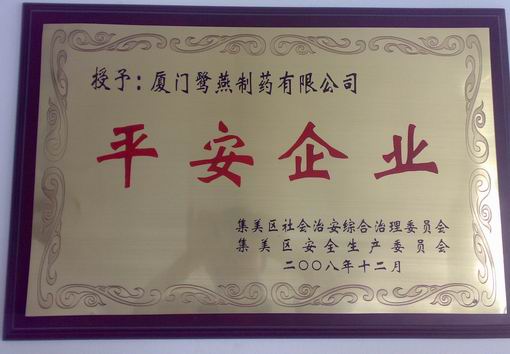 近日,集美區(qū)召開(kāi)了“2008年度平安企業(yè)”表彰大會(huì),廈門鷺燕制藥有限公司從幾百家參評(píng)企業(yè)中脫穎而出,獲此殊榮。