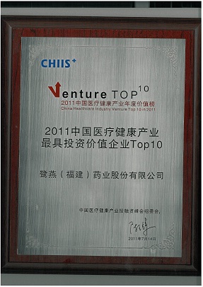 2011年7月14日,在北京舉辦的2011第五屆中國醫(yī)療健康產業(yè)投融資峰會上,鷺燕(福建)藥業(yè)股份有限公司榮獲“2011中國醫(yī)療健康產業(yè)最具投資價值企業(yè)TOP10”稱號。公司于2010年引進建銀國際醫(yī)療產業(yè)基金等投資者近1.5億元投資后,在公司治理、經營業(yè)績、戰(zhàn)略布局等方面得到進一步提升,鞏固了公司在福建省醫(yī)藥流通領域的龍頭地位。