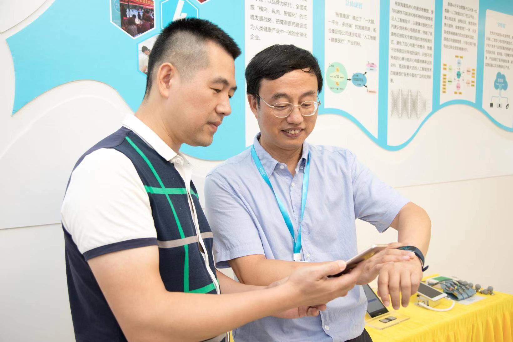 鷺燕醫(yī)藥智慧康源副總經(jīng)理吳朝陽(yáng)向用戶展示如何使用康源AI手環(huán)